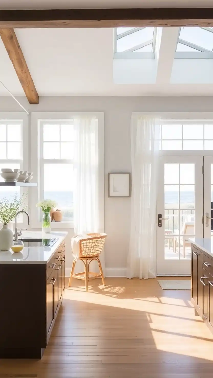 Large windows or glass doors flood the kitchen with natural light, enhancing the airy coastal vibe.
