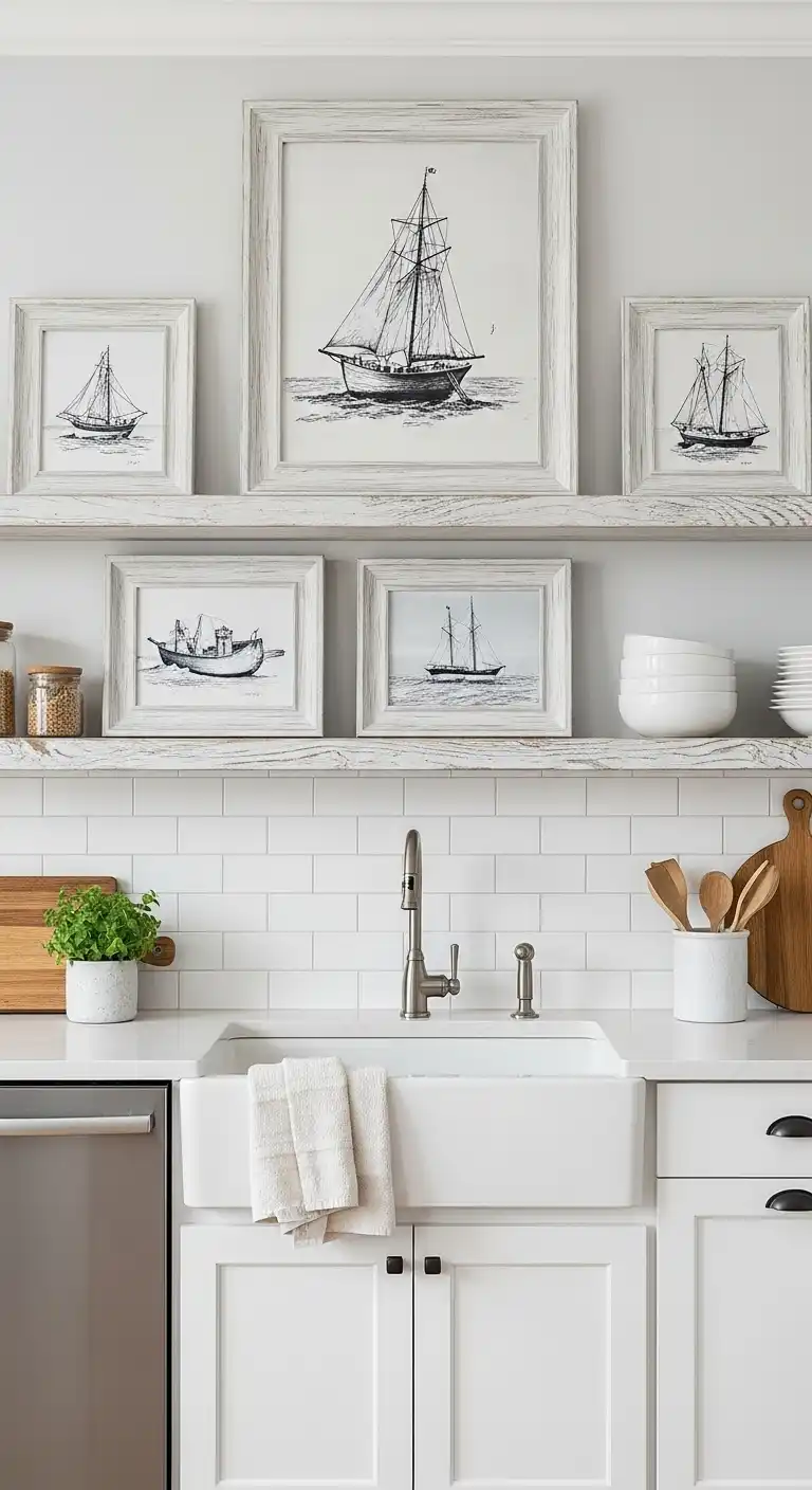 Beach-inspired artwork, such as seascapes or nautical sketches, adds personality to the kitchen.