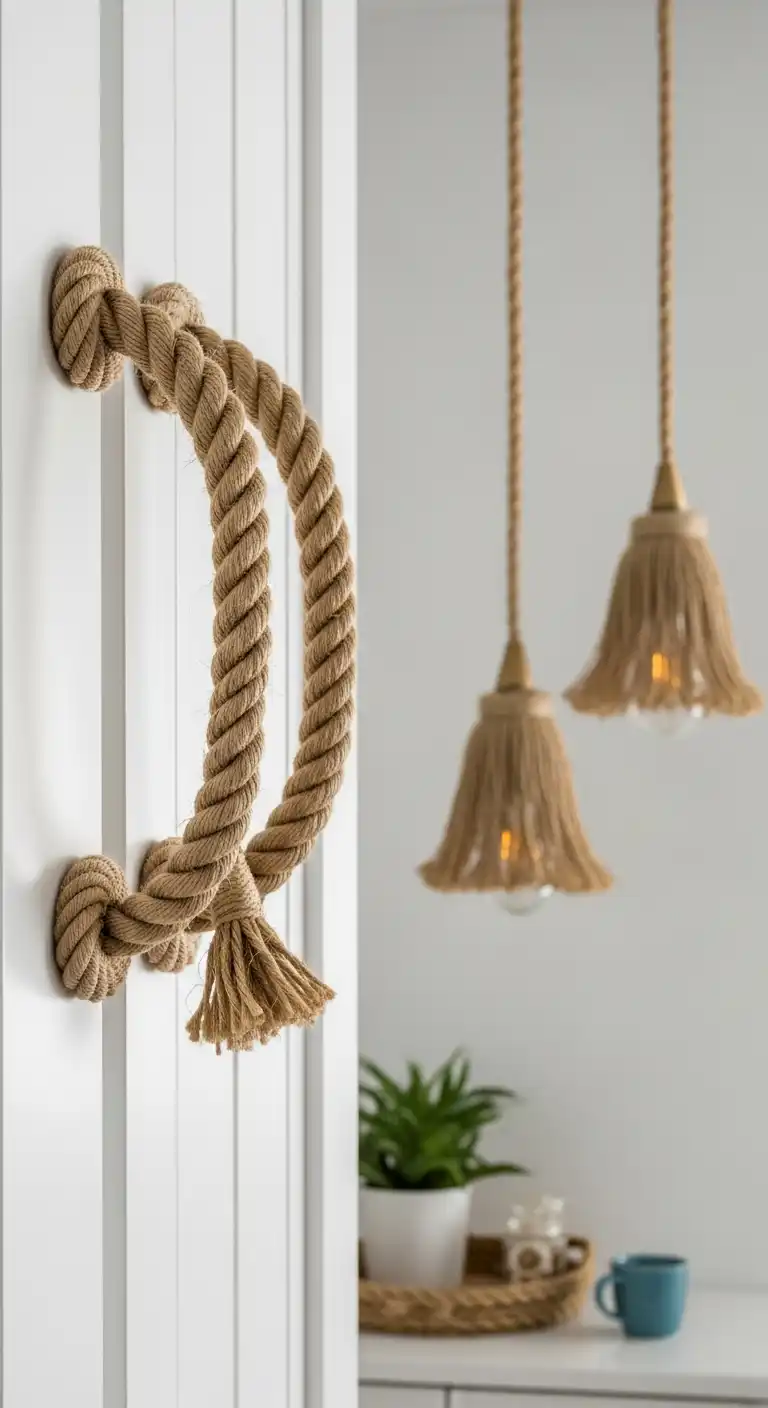 Rope accents, such as cabinet pulls or pendant light cords, nod to nautical themes without being overt.