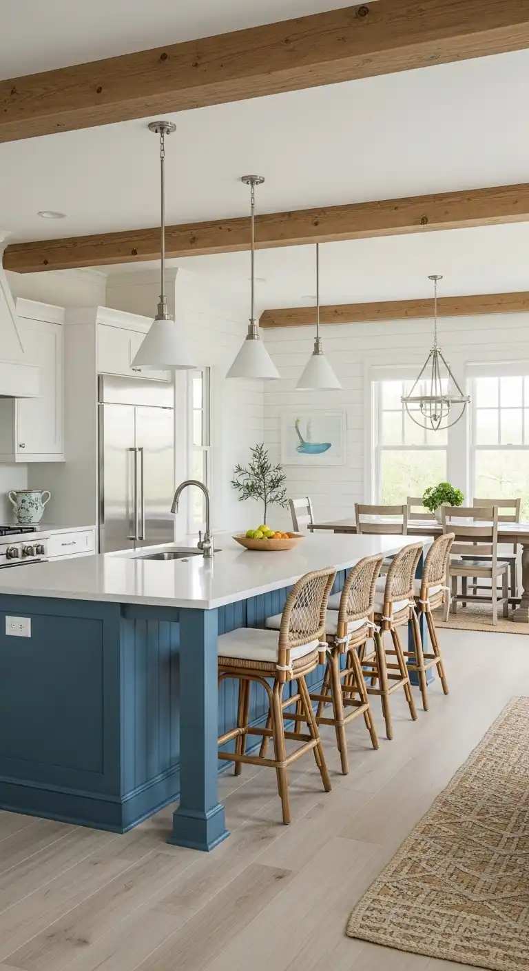 Woven bar stools can enhance the beachy charm, creating a casual, inviting hub.