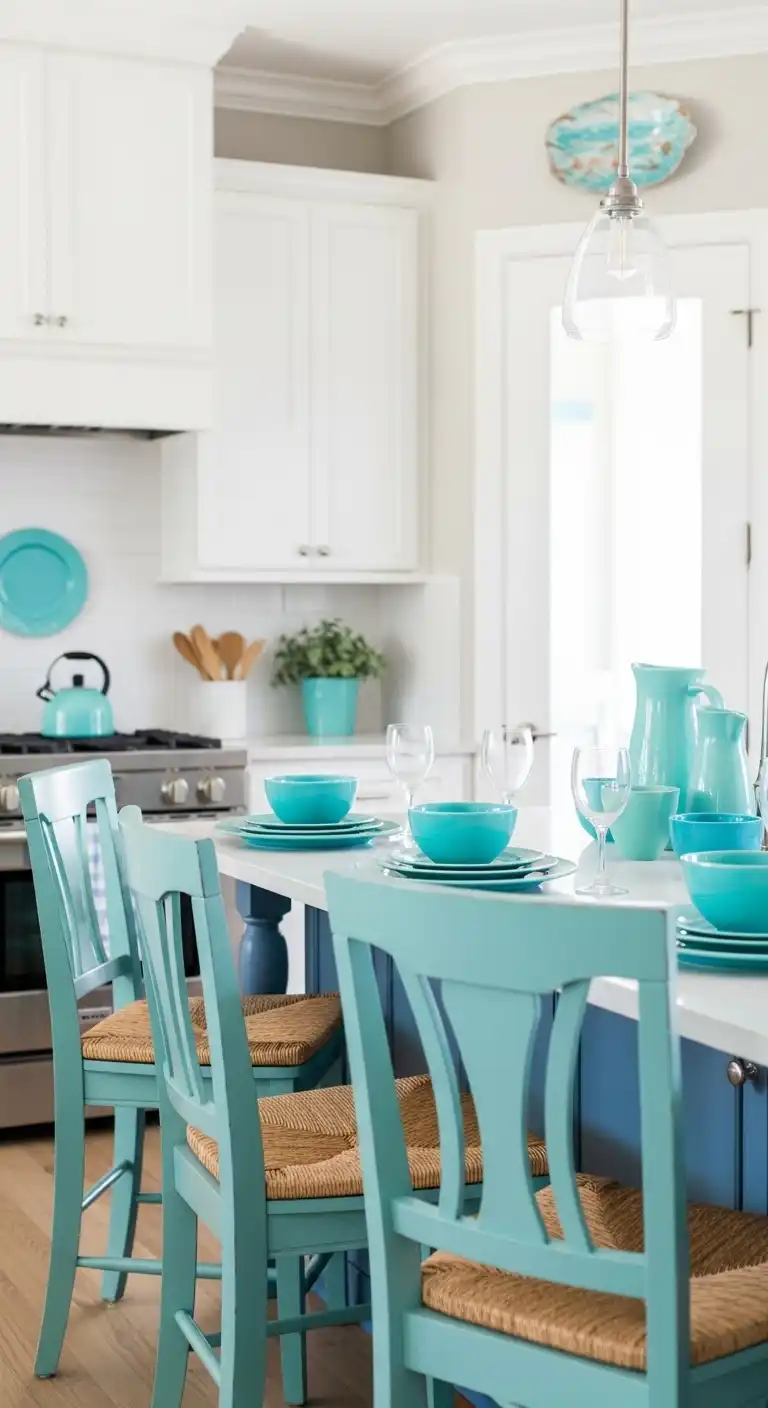 Subtle blue accents, like painted chairs or dishware in aqua or turquoise, infuse the kitchen with ocean-inspired color.