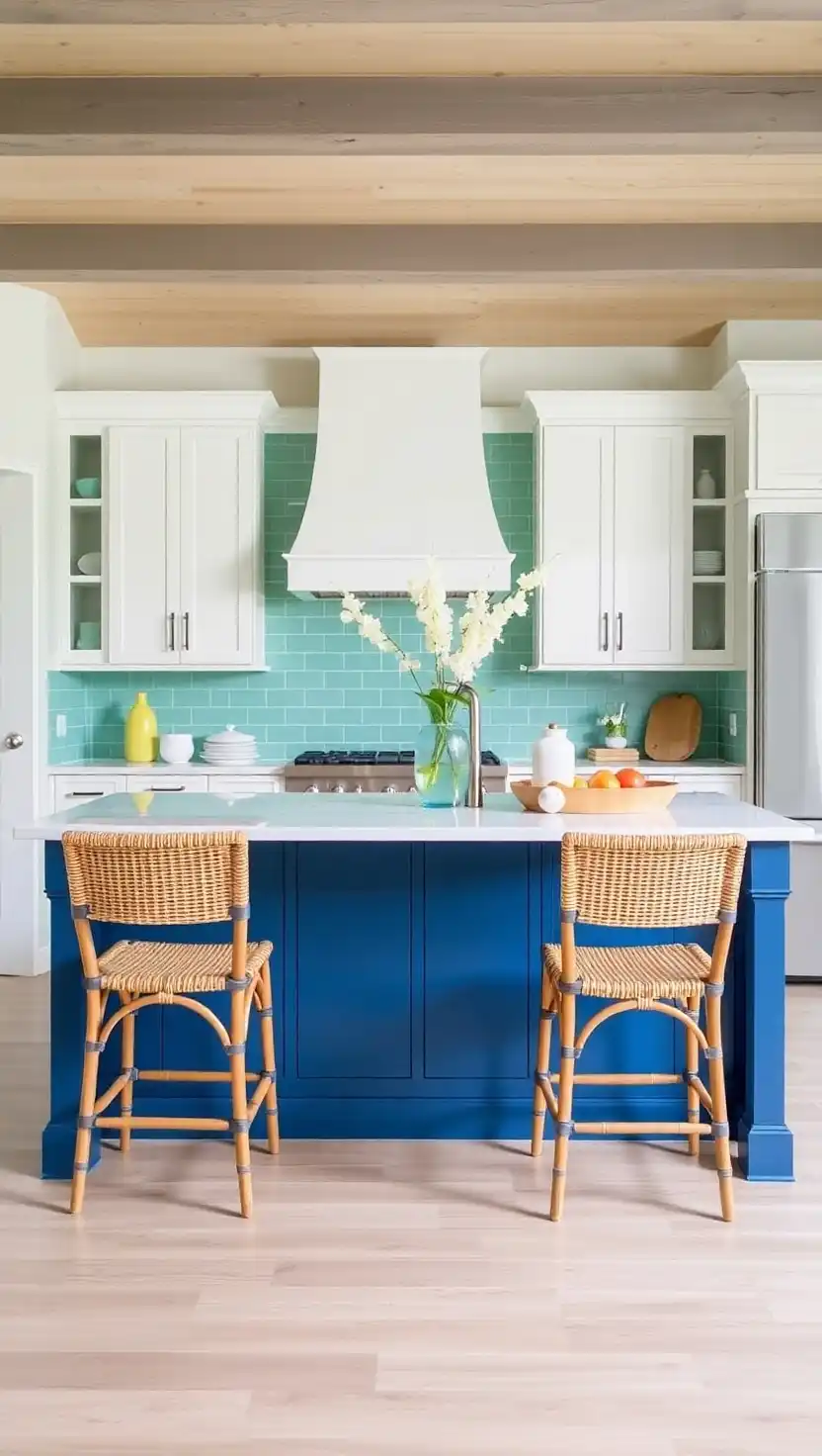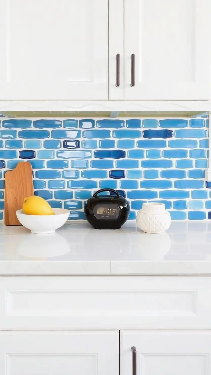 A backsplash inspired by the ocean, such as blue mosaic or glossy white subway tiles, acts as a stunning focal point.