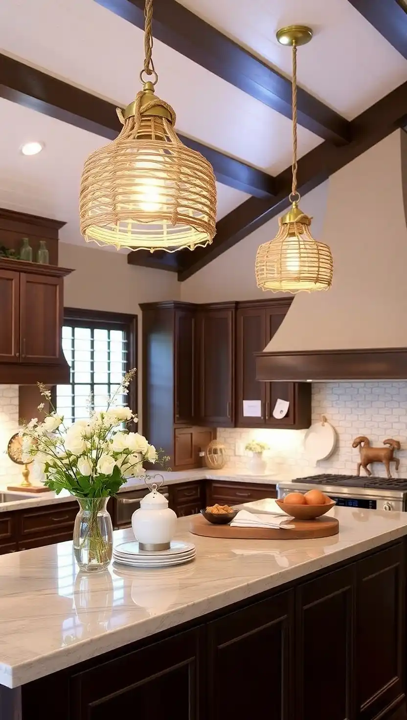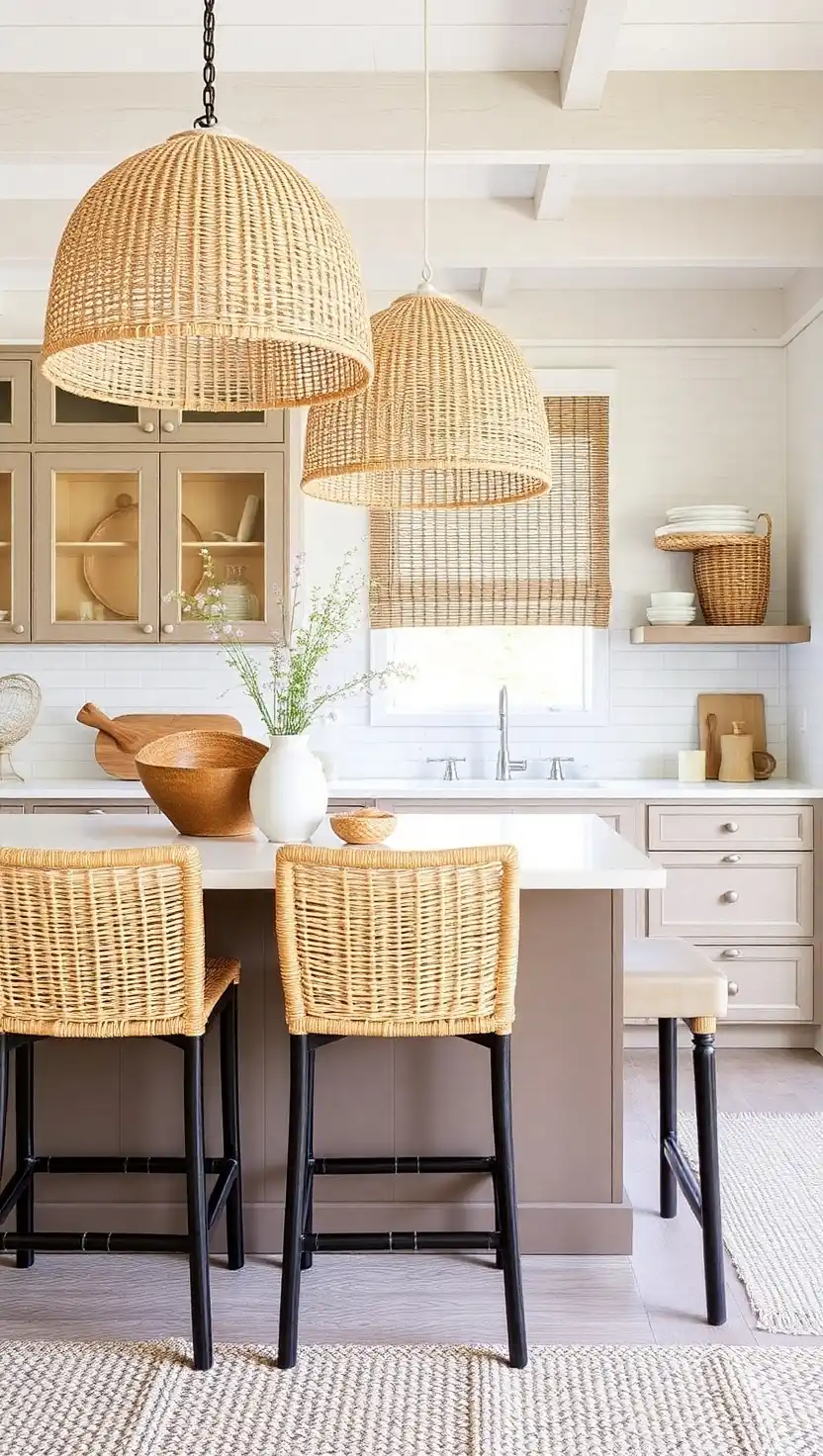 Woven materials like rattan or seagrass bring natural texture to a coastal kitchen.