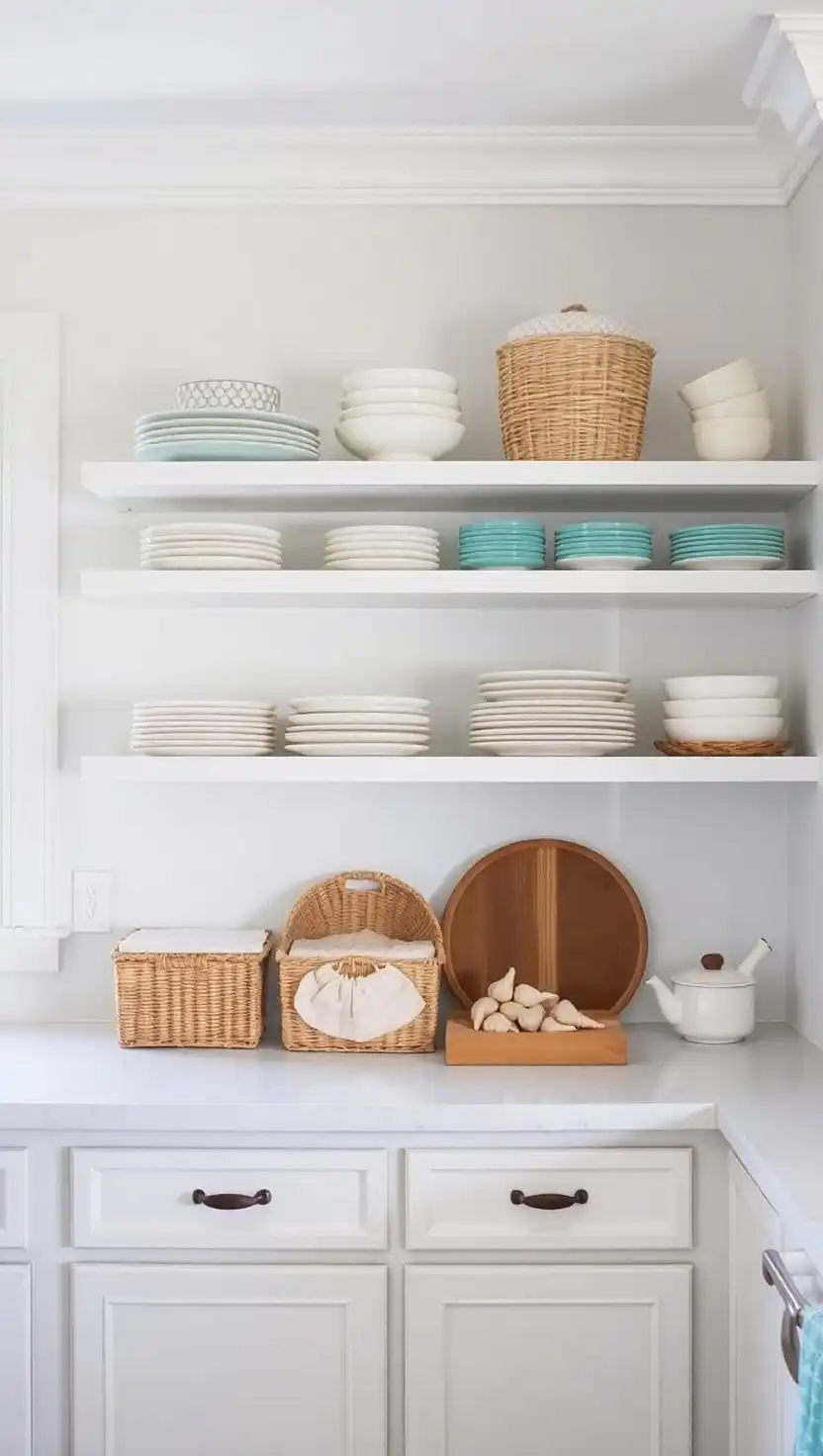 Open shelving creates an airy, spacious feel, perfect for showcasing beach-themed decor like seashells or glassware.