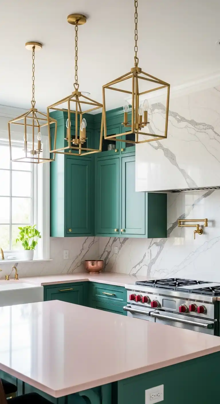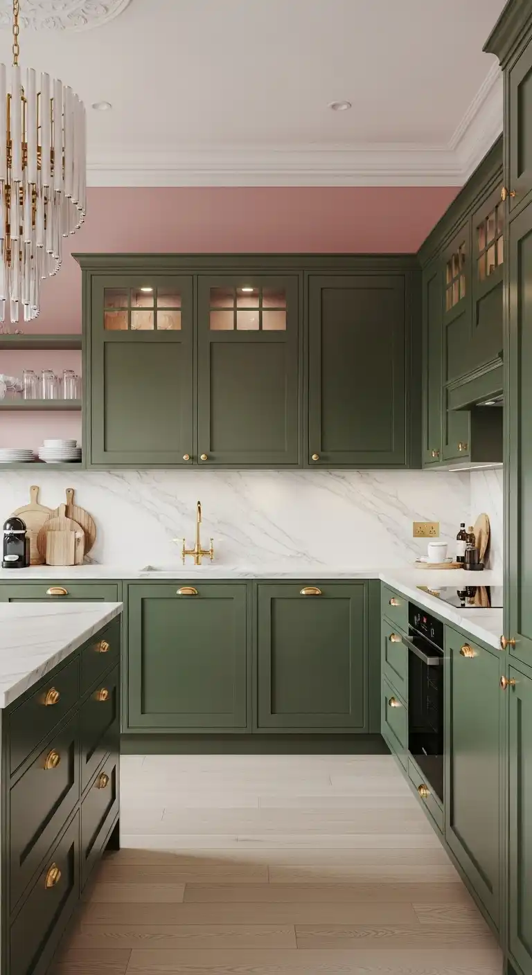 Use green for accents like kitchen islands, cabinets, or backsplash tiles. Lighter pink walls with deep green cabinets look great together.